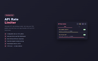 API Rate Limiterは、開発者やQAエンジニア向けに設計された無料のChrome拡張機能で、APIレート制限をシミュレートします。これは、送信されるfetchおよびXHRリクエストを interceptし、ユーザーが指定された時間枠内で行えるリクエストの数を決定するカスタムルールを設定できるようにします。制限を超えた場合、429 Too Many Requestsや503 Service Unavailableなどの設定可能なエラーレスポンスを返すことができます。このツールは、実際のAPIに影響を与えることなく、アプリケーションがレート制限をどのように処理するかをテストするのに特に便利です。